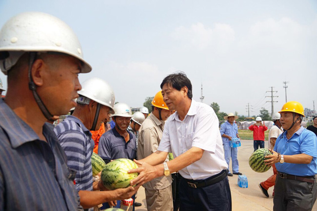 8月3日上午,新安縣產業(yè)集聚區(qū)管委會副主任牛志偉一行帶著西瓜、礦泉水等防暑降溫物品,到萬基控股集團2×60萬千瓦機組工程建設工地慰問施工人員??偨浝砉迮阃?。