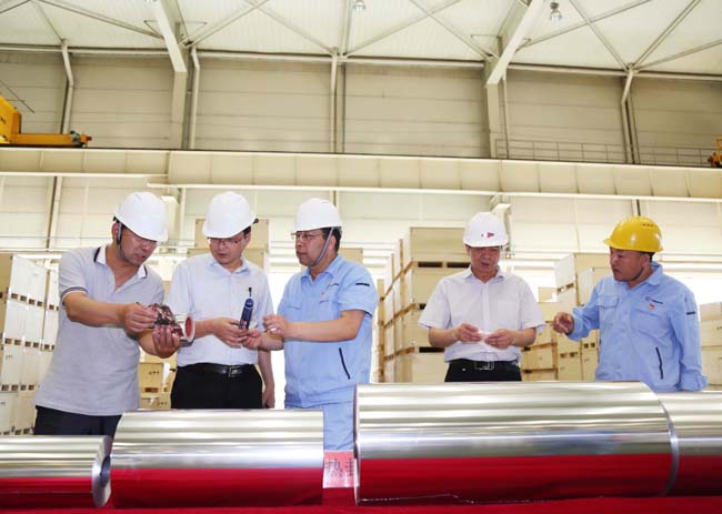 6月1日,洛陽國機重工有限公司張國龍等一行到我公司參觀訪談,集團公司董事長李躍民陪同。圖為在萬基鋁加工公司參觀鋁箔生產(chǎn)線。