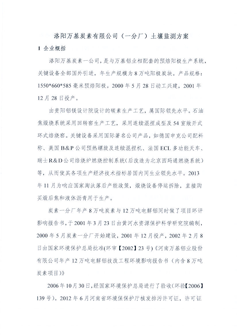 洛陽(yáng)萬(wàn)基炭素有限公司(一分廠)2020土壤自行監(jiān)測(cè)方案