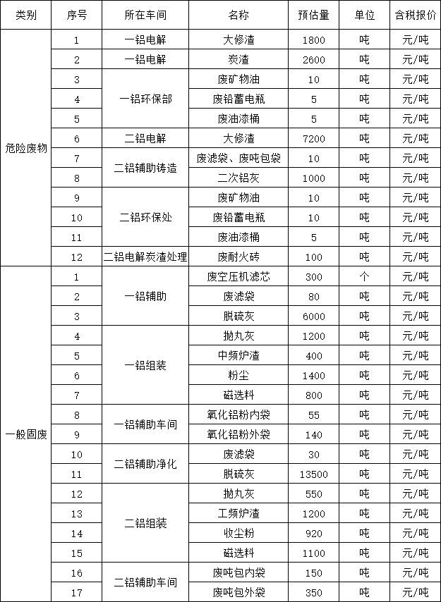 萬(wàn)基控股集團(tuán)招標(biāo)辦近期將對(duì)河南萬(wàn)基鋁業(yè)股份有限公司的危廢(十二項(xiàng));大修渣、二次鋁灰、炭渣等;一般固廢(十七項(xiàng));噸包袋、中頻爐渣、磁選料等物料進(jìn)行銷(xiāo)售招標(biāo)(下附清單),業(yè)主單位不對(duì)該物資的質(zhì)量、用途等做任何承諾,以現(xiàn)場(chǎng)標(biāo)的物現(xiàn)狀為準(zhǔn)。歡迎參與前期實(shí)物勘查。